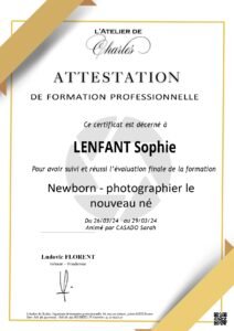 Je suis photographe professionnelle spécialisé dans les nouveau-nés, J’ai suivi une formation pendant 4 jours pour apprendre à manipuler les bébés, connaitre leurs besoins physiologiques, travailler en toute sécurité avec eux. cette formation est certifiante et j’ai réussi l’examen final.